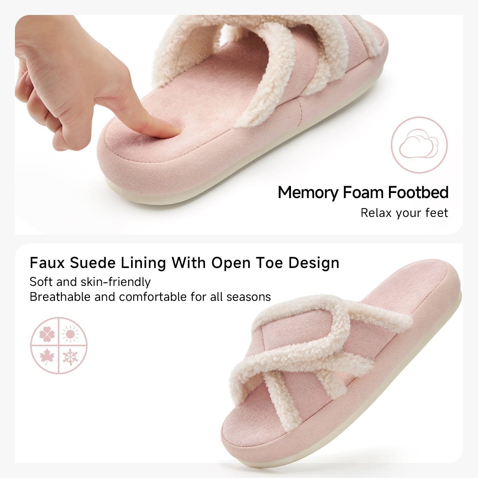 Welcome a softer, sweeter kind of ease into your daily routine with Meadow Petal—comfortable slippers for women that feel like a gentle embrace for tired feet. Designed as pink slippers for women who appreciate a touch of tenderness, this pair features a softly toned suede-touch upper framed with plush faux fur trim. The open silhouette and delicate petal pink hue create a layered look that feels light, airy, and effortlessly charming from the very first step.